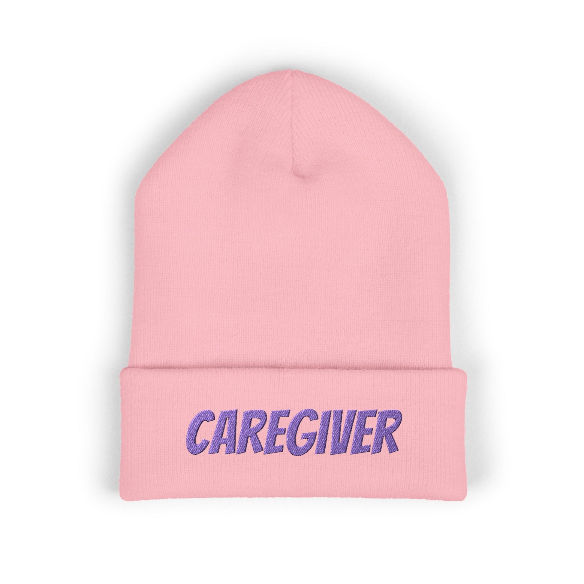 Caregiver Embroidered Cuffed Beanie — Warm Knit Hat w/Purple Stitching