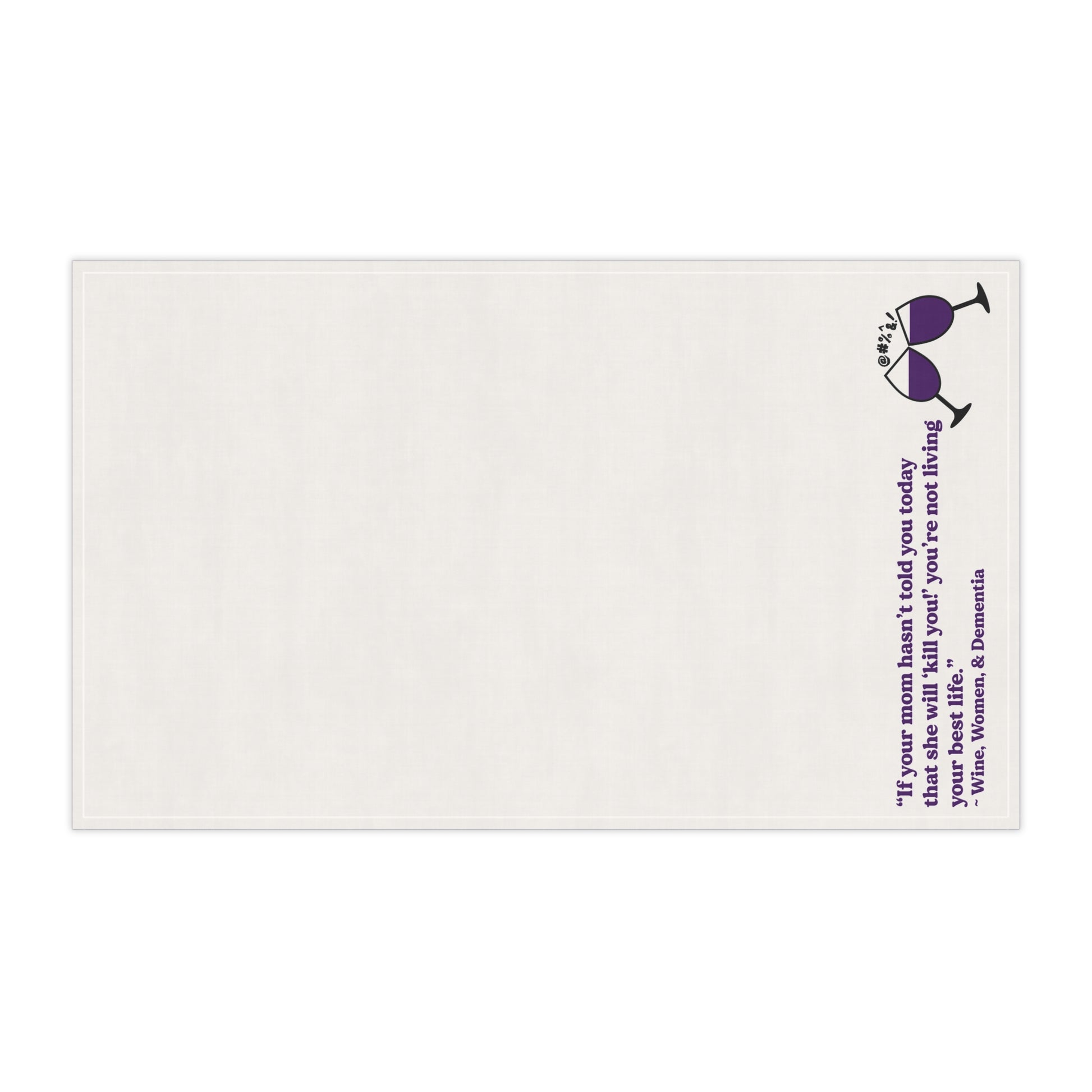 Fun and functional tea towels featuring memorable quotes from the dementia family caregiver documentary, Wine, Women, & Dementia. Add some caregiver humor to your kitchen, especially on those days when smiles are hard to come by. Ideal for caregivers, family members, and loved ones. Relevant for holidays, family gatherings, and everyday use in the kitchen.