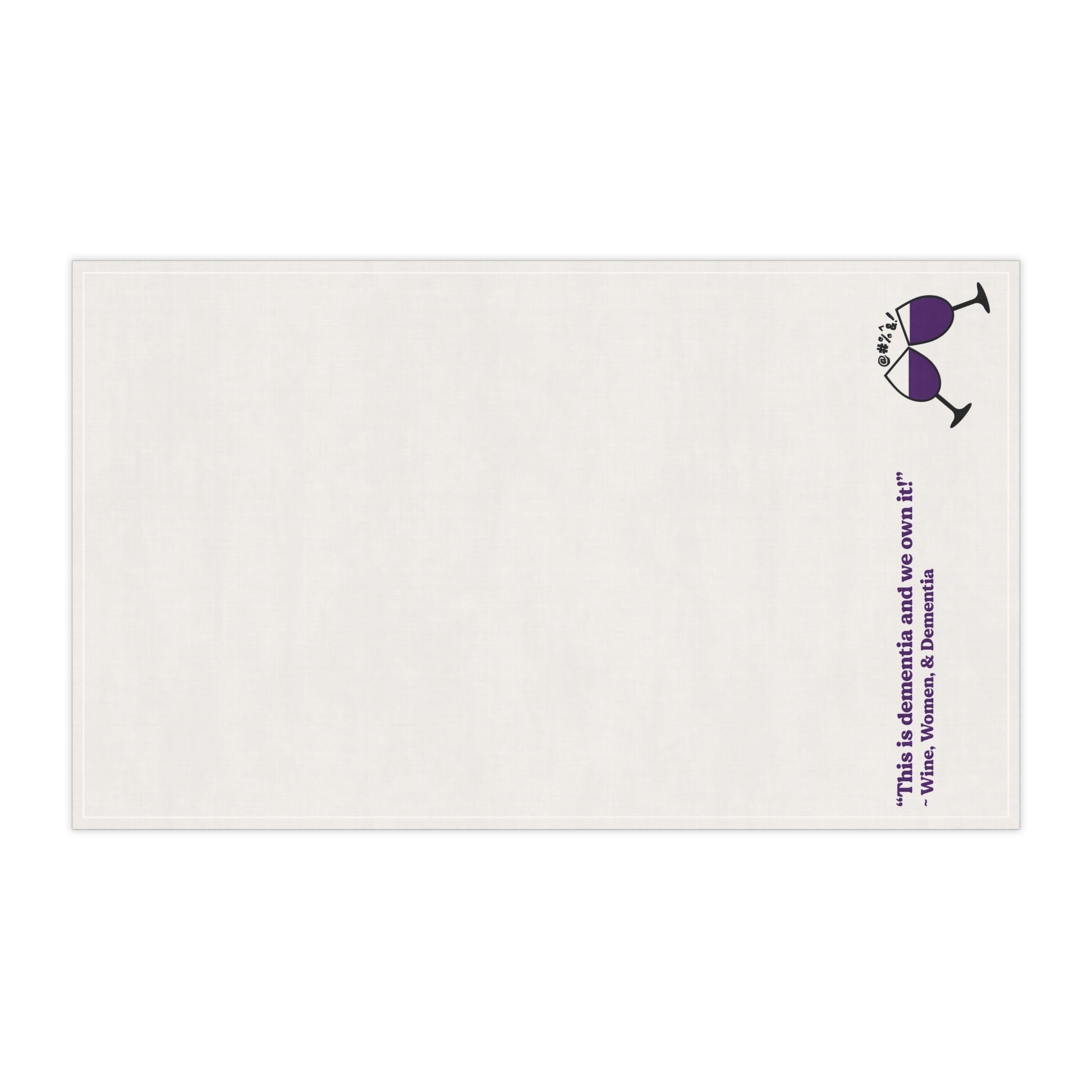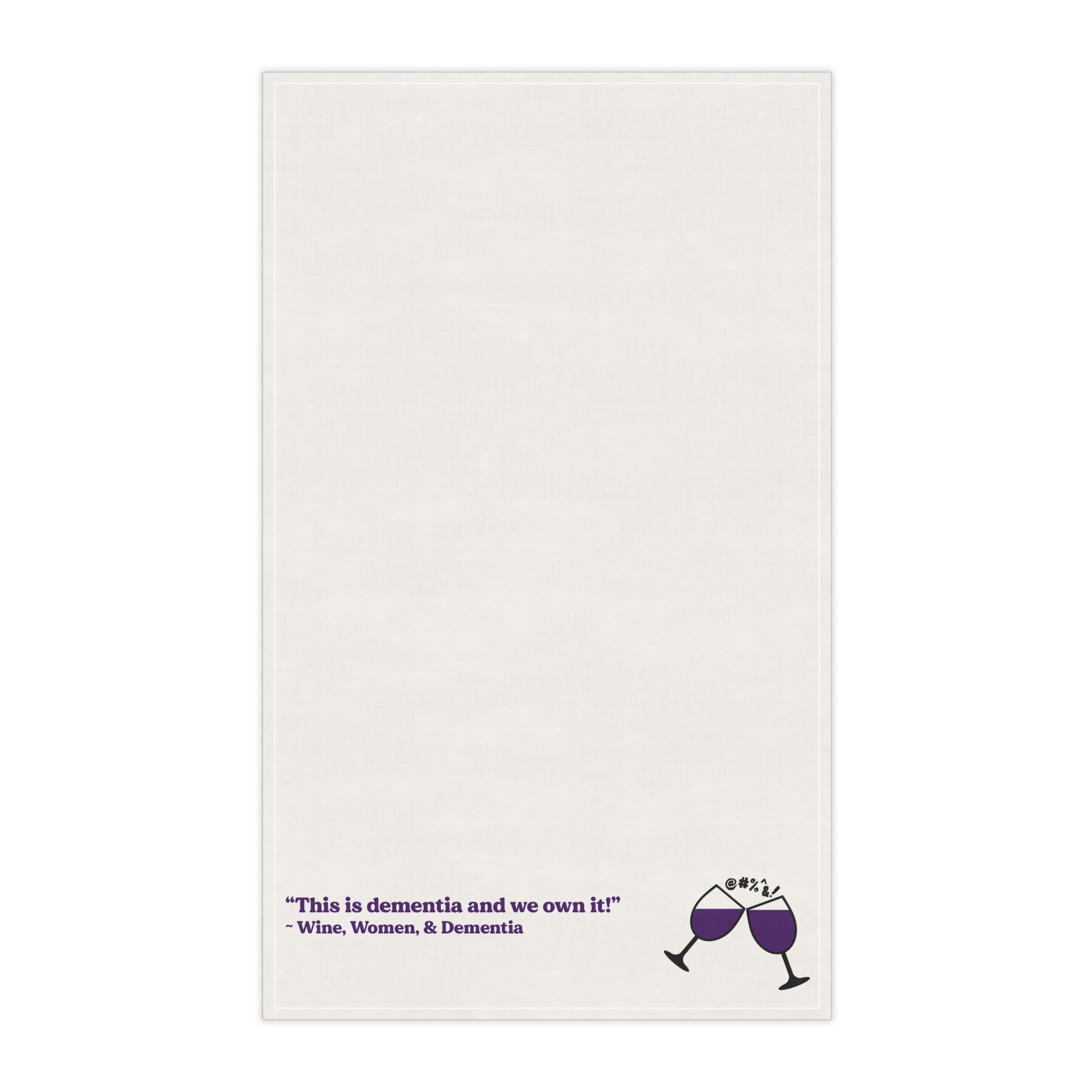 Fun and functional tea towels featuring memorable quotes from the dementia family caregiver documentary, Wine, Women, & Dementia. Add some caregiver humor to your kitchen, especially on those days when smiles are hard to come by. Ideal for caregivers, family members, and loved ones. Relevant for holidays, family gatherings, and everyday use in the kitchen.